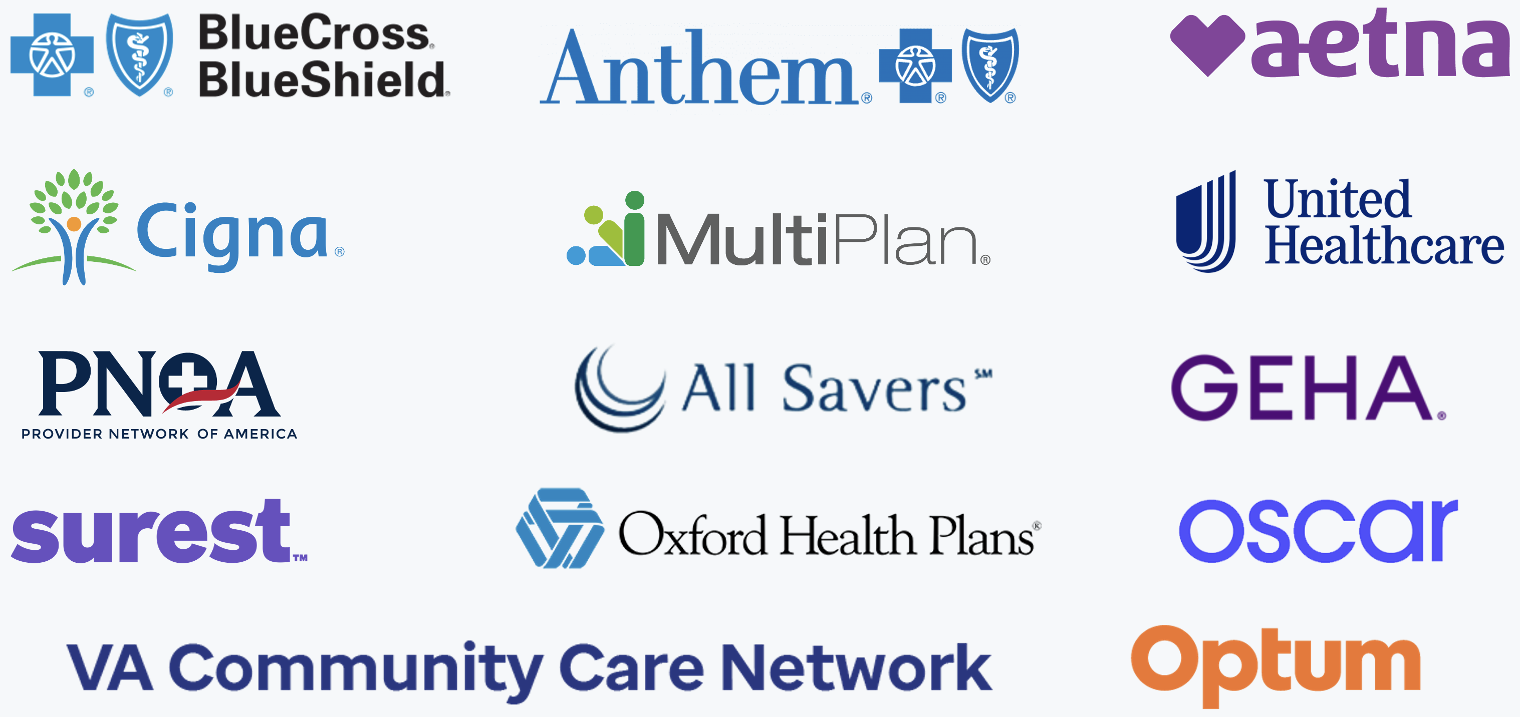 Blue Cross Blue Shield, Anthem, Aetna, United Healthcare, Cigna, MultiPlan, Provider’s Network of America (PNOA), Oscar, GEHA, Surest, Optum, Oxford Health Plan, All Savers, VA Community Care Network, and more!